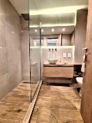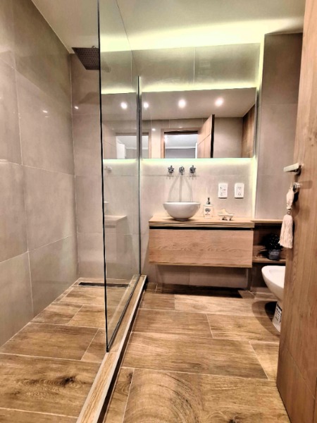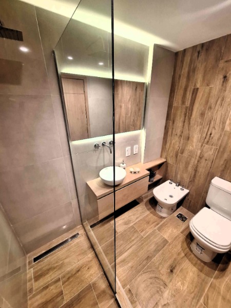 - Baño principal completo con mampara corrediza de vidrio templado y espejo LED.