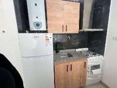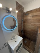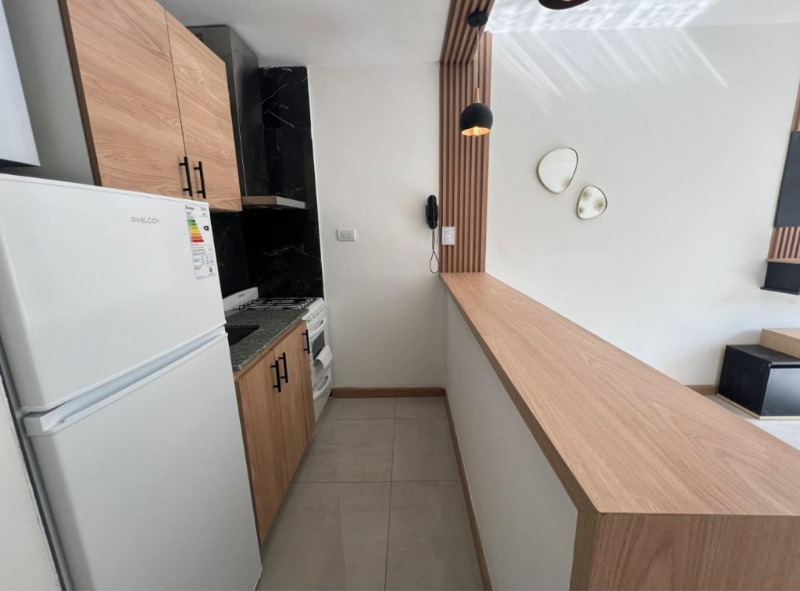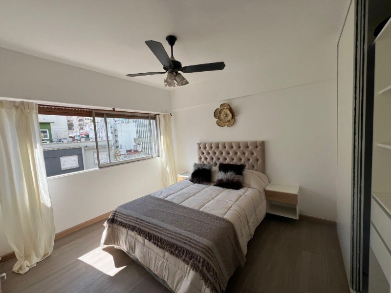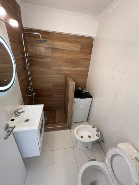 El dormitorio cuenta con placard empotrado, pisos de porcelanato símil madera y ventilador de techo, destacándose por su luz natural. El baño fue reciclado, revestido en porcelanato, con ducha y espacio para lavarropas.